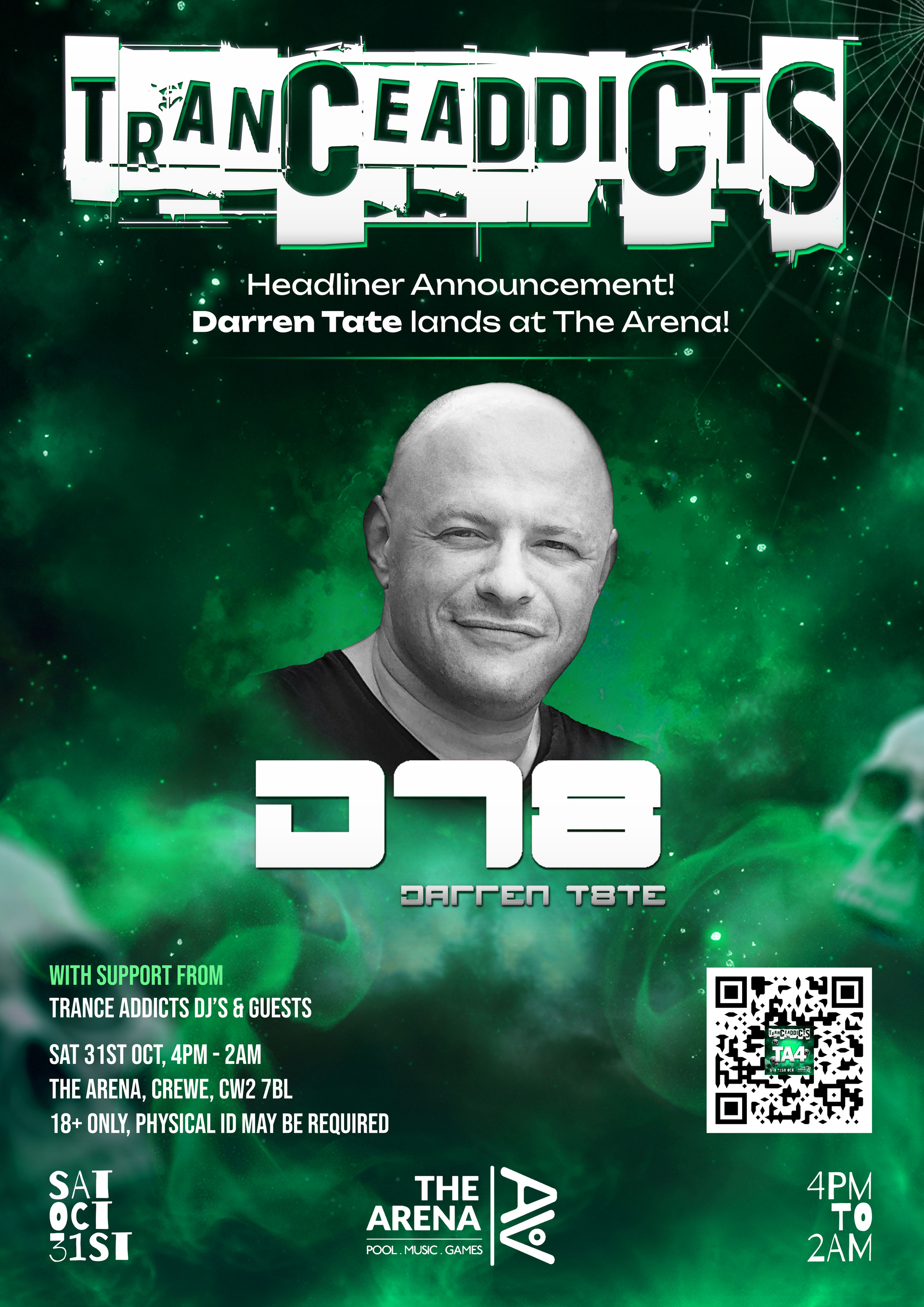 Trance Addicts returns for our fourth live event as we take over The Arena, Crewe for a full Halloween-themed day and night of trance, energy and proper community atmosphere. What started as a space for people who genuinely love the music has grown into something special, and TA4 is all about bringing that passion back to the dancefloor with another massive session surrounded by like-minded trance lovers. Fancy dress is optional, the vibes will be spot on, and we are buzzing to welcome the one and only Darren Tate as our headline act for this one.